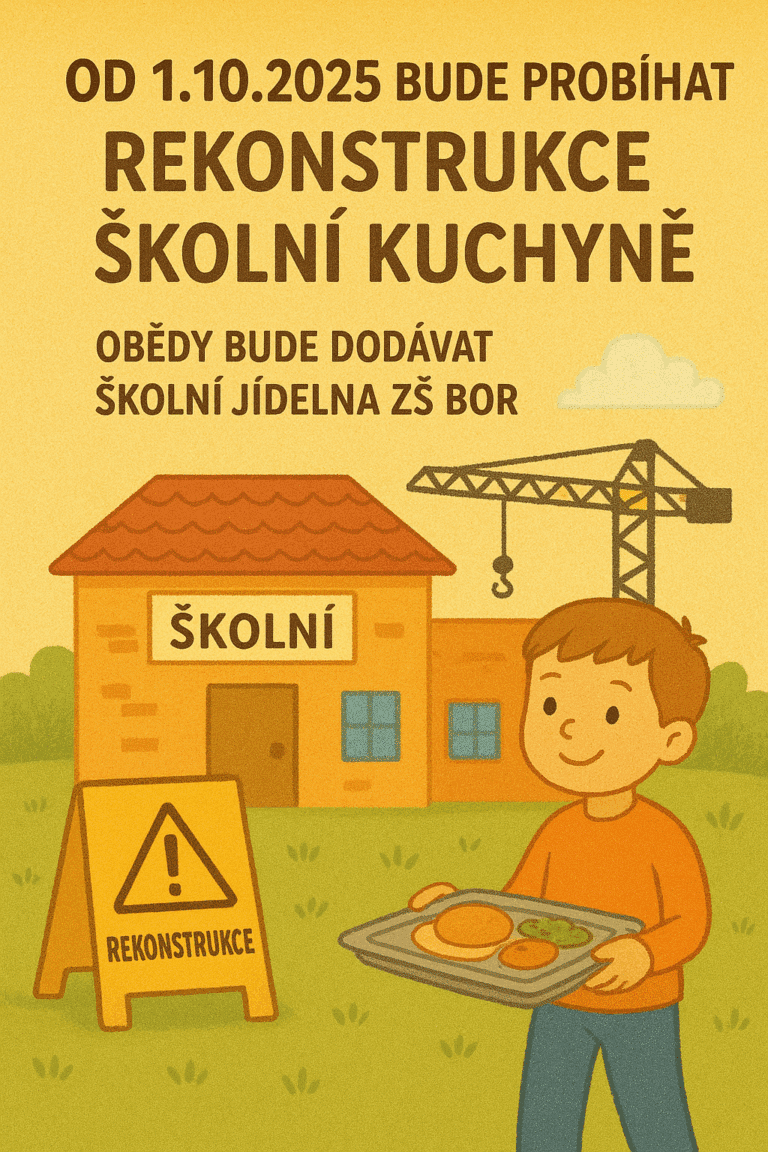 Od 1. 10. 2025 bude probíhat rekonstrukce školní kuchyně. Obědy bude dodávat školní jídelna ZŠ Bor.Bude připravován oběd č.